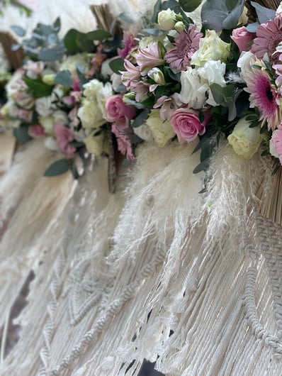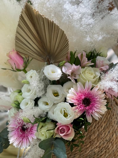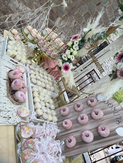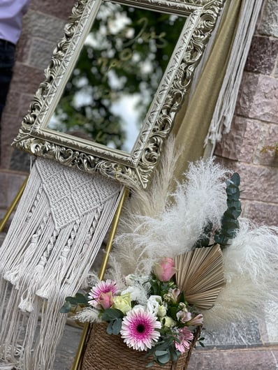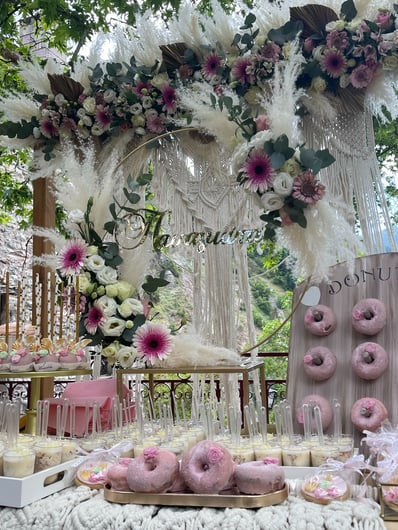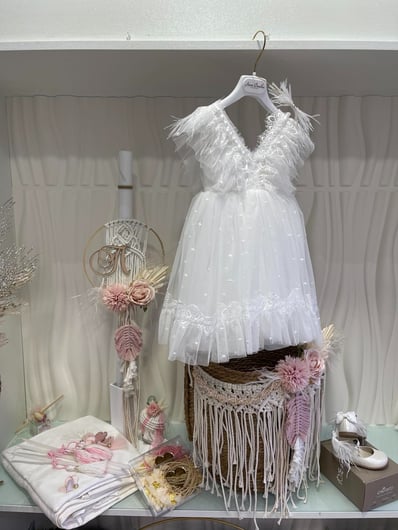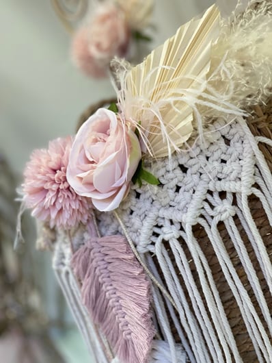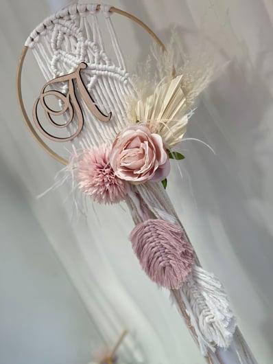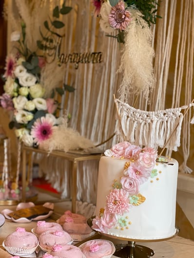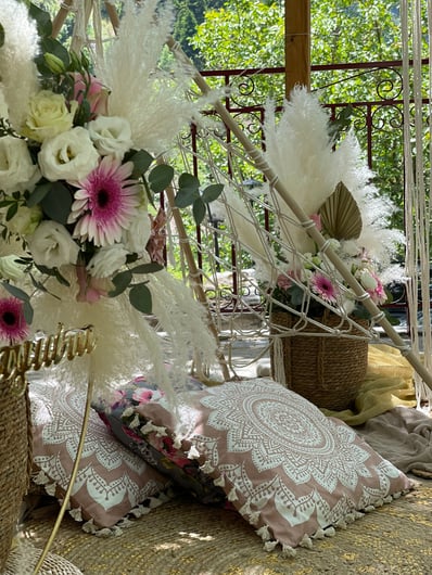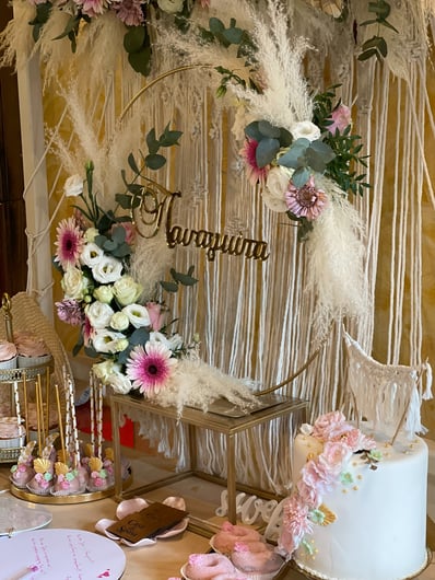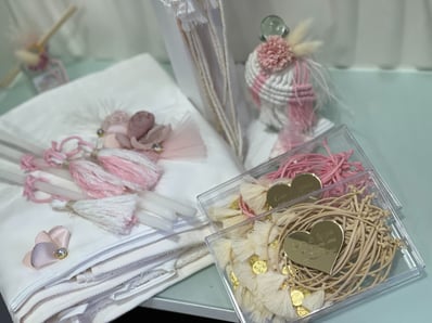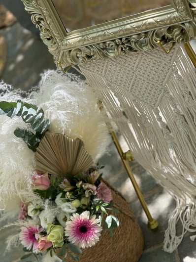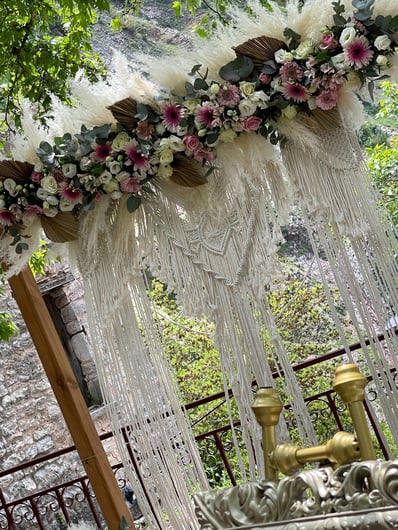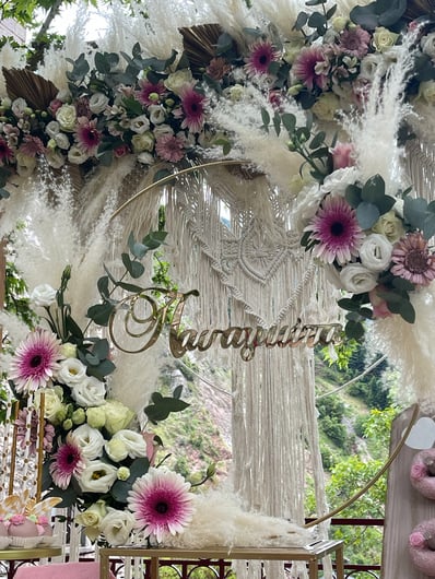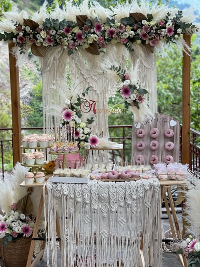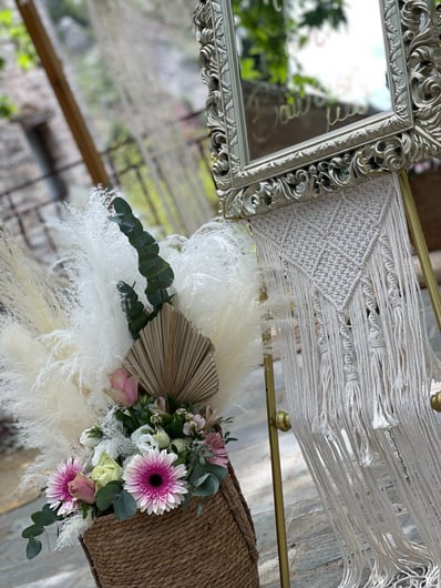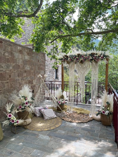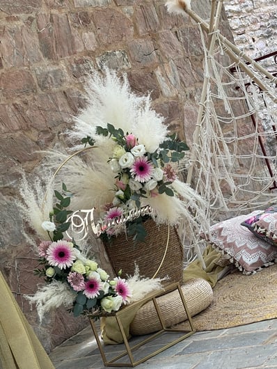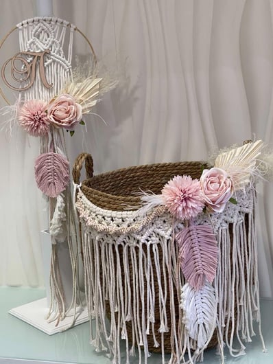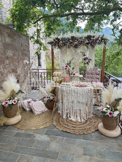 Η boho βάπτιση της Παναγιώτας Μια boho βάπτιση οργανώθηκε και στήθηκε στην Ιερά Μονή Προυσού. Με έντονο το στοιχείο των λουλουδιών, δίχρωμες ζέρμπερες, λευκοί λυσίανθοι, ροζ ζέρμπερες, αλστρομέριες, pampas grass, πλεκτά macrame, σκηνές και ψάθινες λεπτομέρειες η βάπτιση της μικρής Παναγιώτας απλά απογειώθηκε…Δεν θα μπορούσαν φυσικά να λείπουν γλυκάκια στολισμένα με boho λεπτομέρειες στα χρώματα της βάπτισης.. Το σύνολο ολοκληρώθηκε με ένα χειροποίητο βαπτιστικό πακέτο ασορτί και ένα υπέροχο φόρεμα με φτερά στρουθοκαμήλου της εταιρίας STOVA BAMBINI.