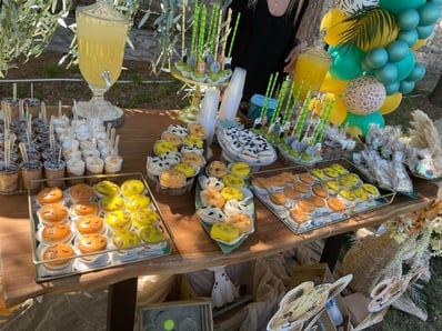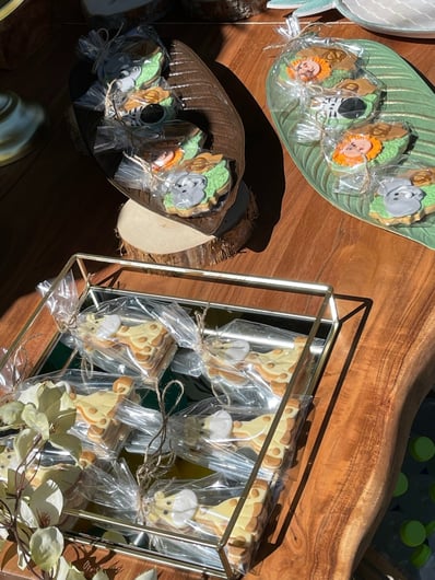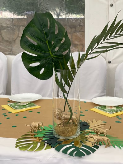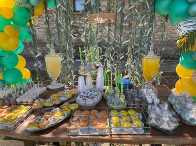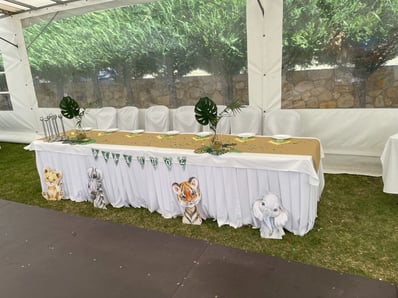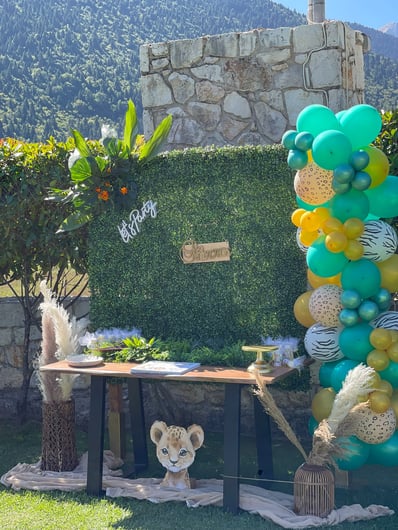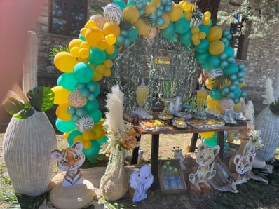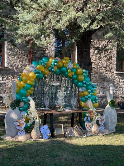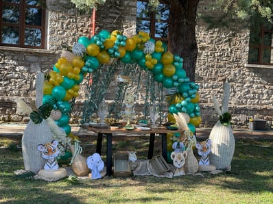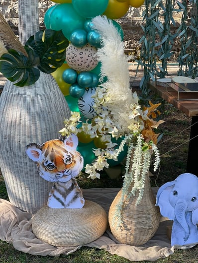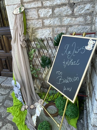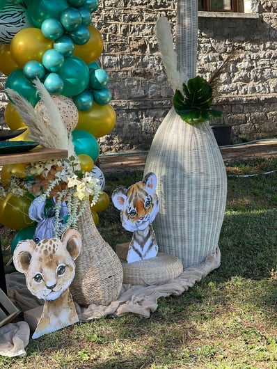 Καλοκαιρινή βάπτιση ζούγκλα. Λιονταράκια, ελέφαντες, τίγρεις, καμηλοπαρδάλεις, ζέβρες, εξωτικά φυλλώματα και λουλούδια συνθέτουν ένα φανταστικό σκηνικό ζούγκλας για την βάπτιση του μικρού Φίλιππου.Δροσερά ποτά και πεντανόστιμα γλυκίσματα με απίθανες λεπτομέρειες από τα ζωάκια της ζούγκλας ξετρέλαναν μικρούς και μεγάλους.. το σύνολο ολοκληρώθηκε με ένα ασορτί πακέτο βαπτιστικών.