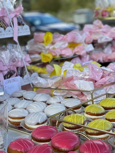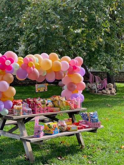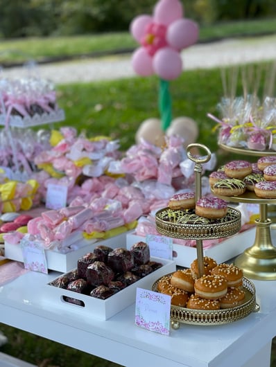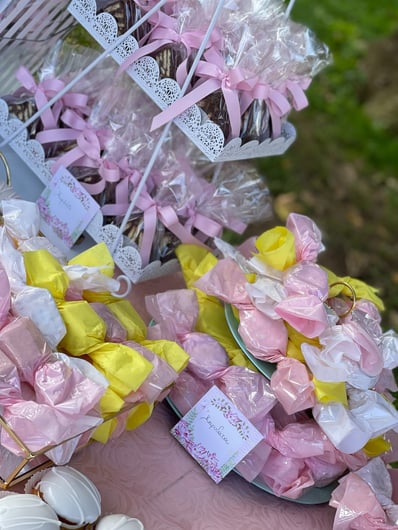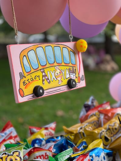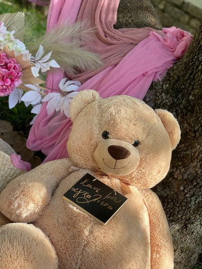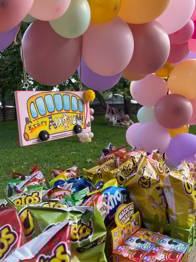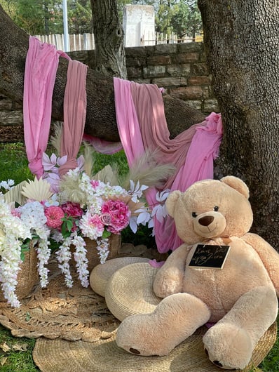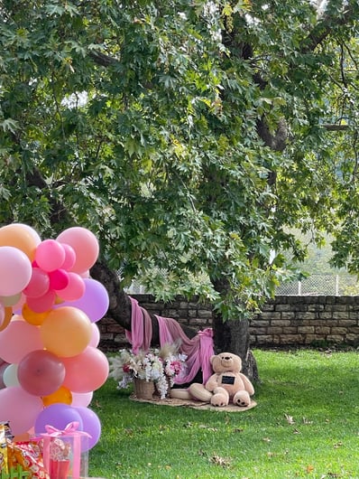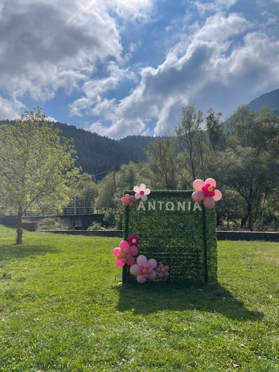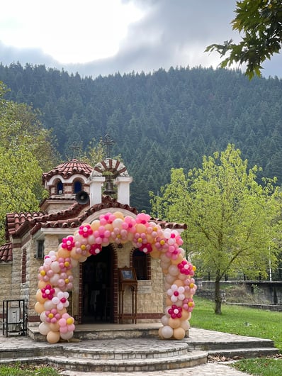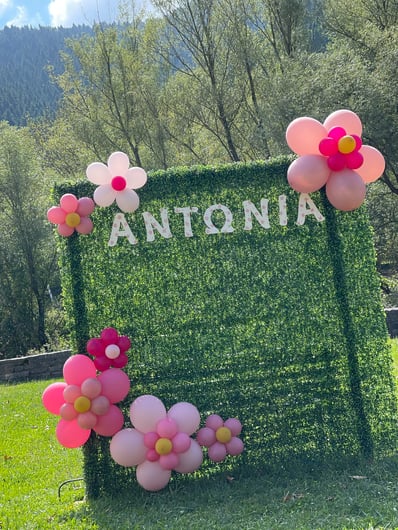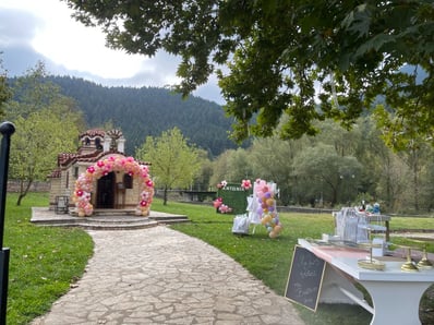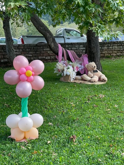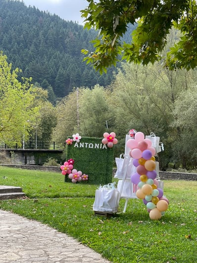 Σε αυτή τη βάπτιση έμπνευση αποτέλεσε για εμάς η αναμνήσεις της μαμάς από τα παιδικά της χρόνια στο χωριό. Χρόνια γεμάτα αθωότητα, ελευθερία και ένα μικρό ψιλικατζίδικο της γειτονιάς που ήταν γεμάτο λιχουδιές. Σχεδιάσαμε λοιπόν για αυτή τη βάπτιση γωνιές φωτογράφισης που θυμίζουν τα παιδικά μας χρόνια.. Μια γωνιά έγινε ένα μικρό περίπτερο γεμάτο λιχουδιές, μια άλλη γωνιά με έναν τεράστιο αρκούδο καλούσε όλα τα παιδάκια να του κάνουν μια μεγάλη ζεστή αγκαλιά, μια ακόμη γωνιά με πράσινο φόντο και λουλουδένια μπαλόνια καλούσε τους φίλους για μια φωτογραφία, μια ιδιαίτερη γωνιά ήταν αυτή με τα κλασικά σοκολατάκια με το ολόκληρο φουντούκι που συνόδευαν τα χειροποίητα λικέρ και το τσίπουρο που απολάμβαναν οι μεγάλοι καλεσμένοι. Τέλος μια γωνιά με αλμυρά και γλυκά κεράσματα δε θα μπορούσε να λείπει. Την κεντρική σκηνή όμως έκλεβε μια πελώρια αψίδα γεμάτη μπαλόνια και λουλούδια που πλαισιώνει την είσοδο του Ναού.