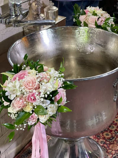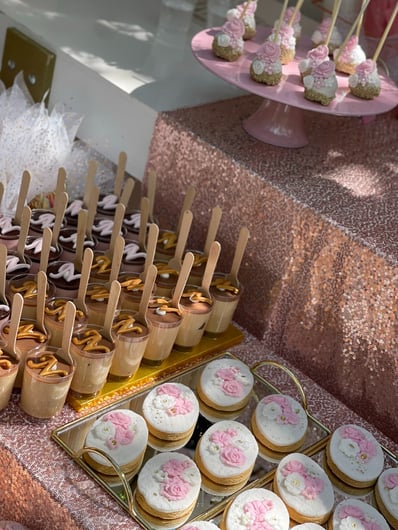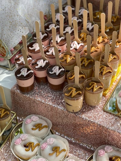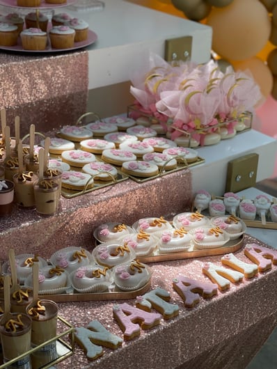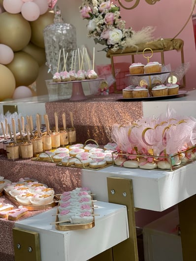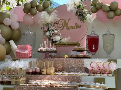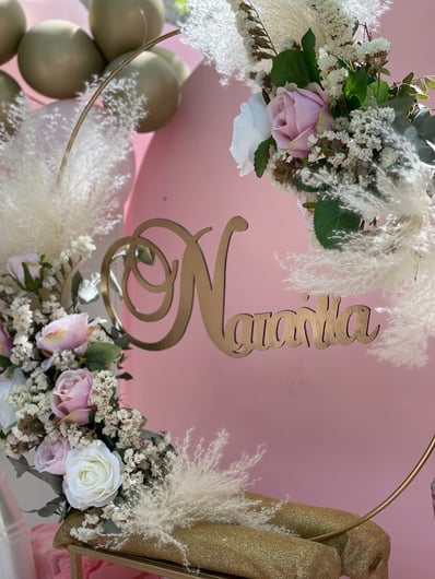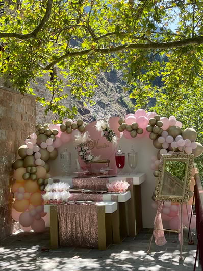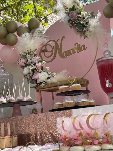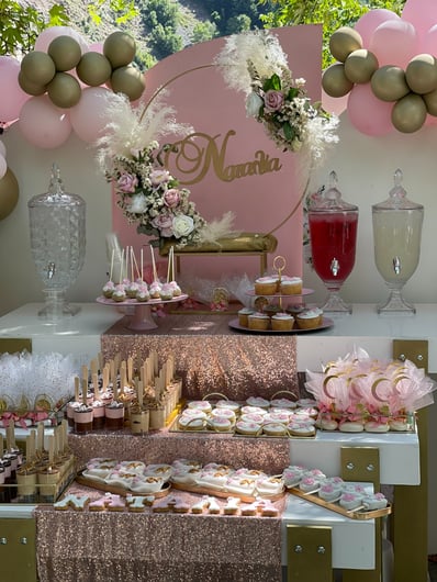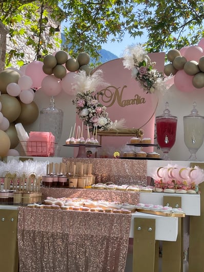 Καλοκαιρινή βάπτιση με αψίδα μπαλονιών. Το σκηνικό της βάπτισης της μικρής Ναταλίας στον Προυσό ήταν γεμάτο με ροζ-χρυσά μπαλόνια που σχημάτιζαν μια εντυπωσιακή αψίδα γύρω από το τραπέζι των κερασμάτων.Τα κεράσματα στολίστηκαν με τριανταφυλλάκια ζαχαρόπαστας και χρυσές λεπτομέρειες και έκλεψαν την παράσταση μαζί με το χαμόγελο της μικρής νεοφώτιστης.